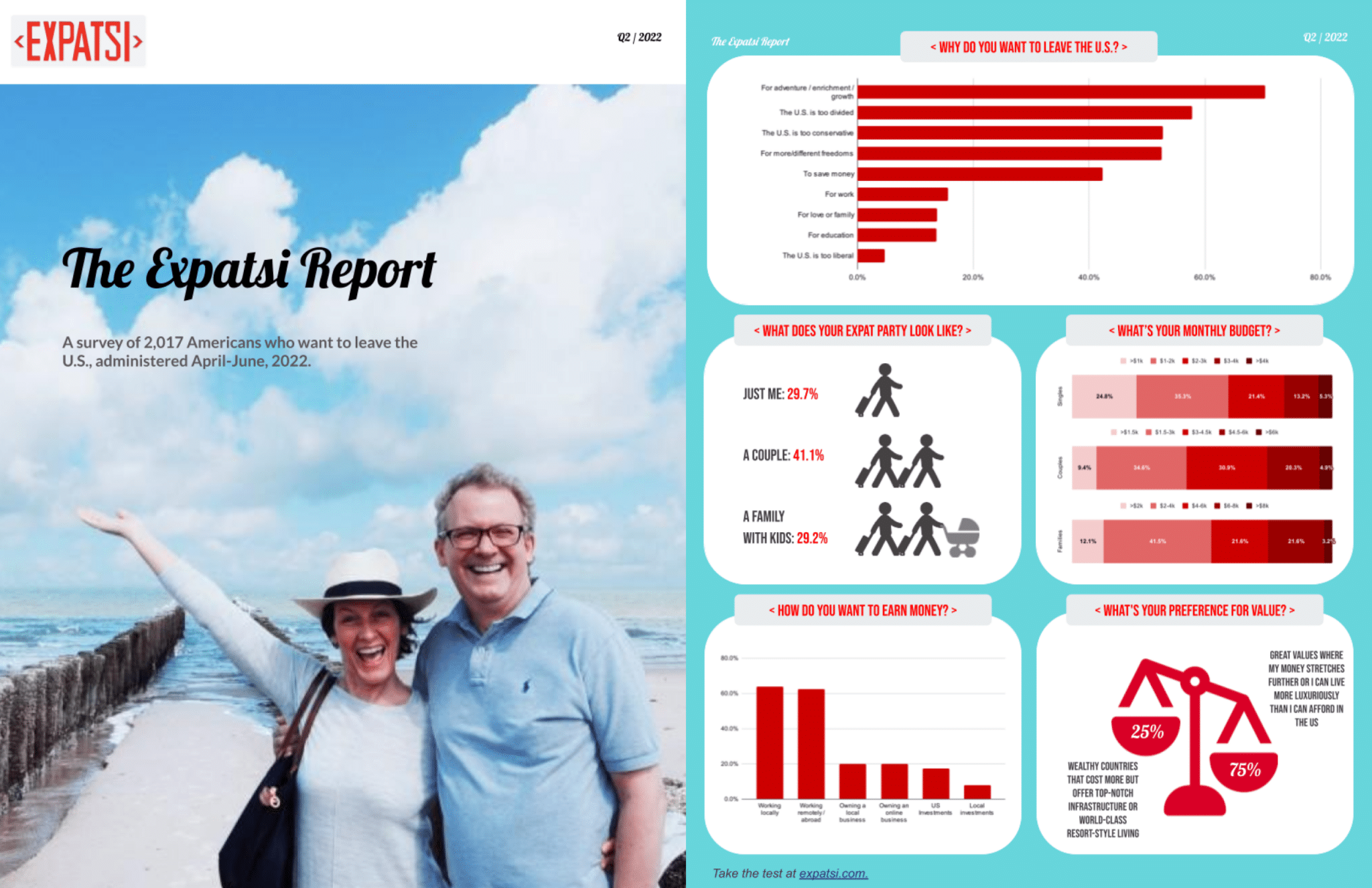 Welcome to the very first Expatsi Report! This quarterly report will track why people want to leave the U.S., what they’re looking for, what they have to spend, and more. See the images above, or download a PDF, below.